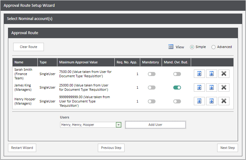 Approval routes will always work from the top down (e.g. James to Henry); the first approver will always need to sign the document and if it is within their approval value, will look for any other steps marked as mandatory or mandatory over budget. If no other steps are mandatory, the document will be fully approved. If the first approver does not have sufficient approval value to approve the document, it will go to the next approval step and keep progressing until a user has adequate approval value. Any further steps will be checked for mandatory or mandatory over budget flags and either direct for additional approval or the document will be fully approved.