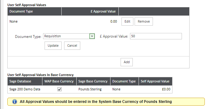 User Self-Approval Values: if a user is allowed to enter and automatically approve a document up to a certain value, set a maximum self-approval value per document type as shown below. Certain document types (e.g. Expenses) would not usually have a self-approval value allocated. Make sure to click Update before saving.